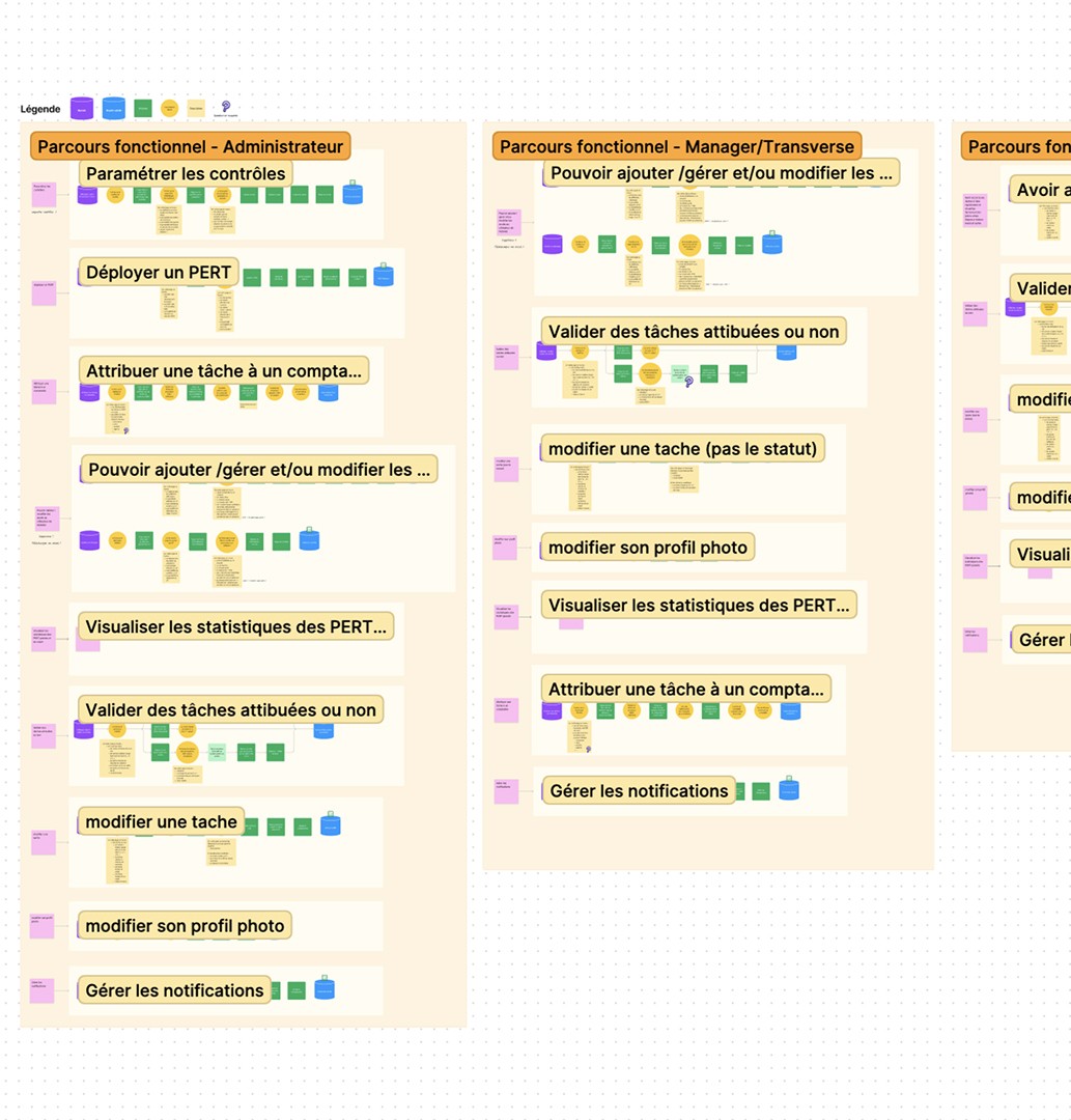 Ces parcours sont minutieusement conçus pour refléter les étapes spécifiques que les utilisateurs suivront pour accomplir leurs tâches de manière efficace. Chaque étape est directement liée à un besoin fonctionnel identifié lors des interviews utilisateurs, assurant ainsi une adéquation précise entre les attentes des utilisateurs et les fonctionnalités de l'outil.