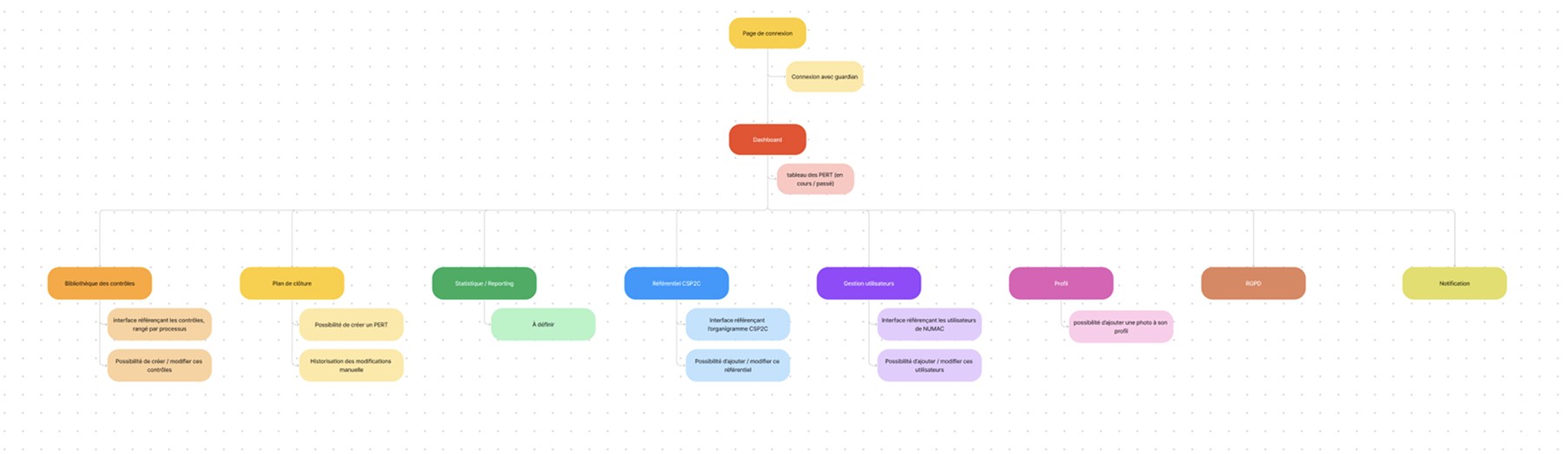 Le sitemap, ou plan de site, est une représentation visuelle de l'architecture de l'information, décrivant la structure hiérarchique des pages et des fonctionnalités au sein de l'application. Il permet de définir la disposition logique des contenus et des interactions, offrant ainsi une vue d'ensemble stratégique de la manière dont les utilisateurs navigueront dans l'outil métier lors de la clôture comptable. Le sitemap facilite la compréhension des relations entre les différentes sections et fonctionnalités, aidant à anticiper les besoins de navigation des utilisateurs.