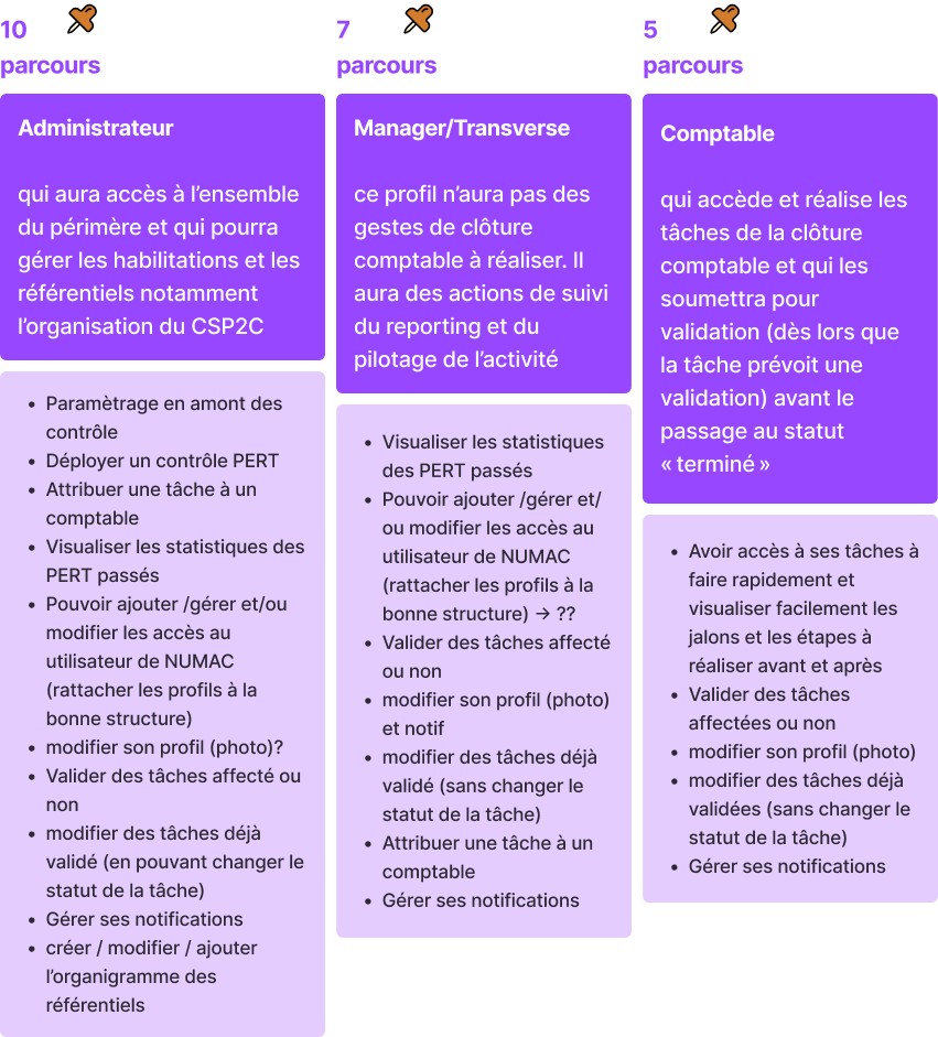 Les parcours utilisateurs découlant des besoins fonctionnels définissent la trajectoire interactive et opérationnelle au sein de l'outil métier pour la clôture comptable. Ils ont été réalisés par personnae afin de couvrir l’ensemble des besoins identifiés.