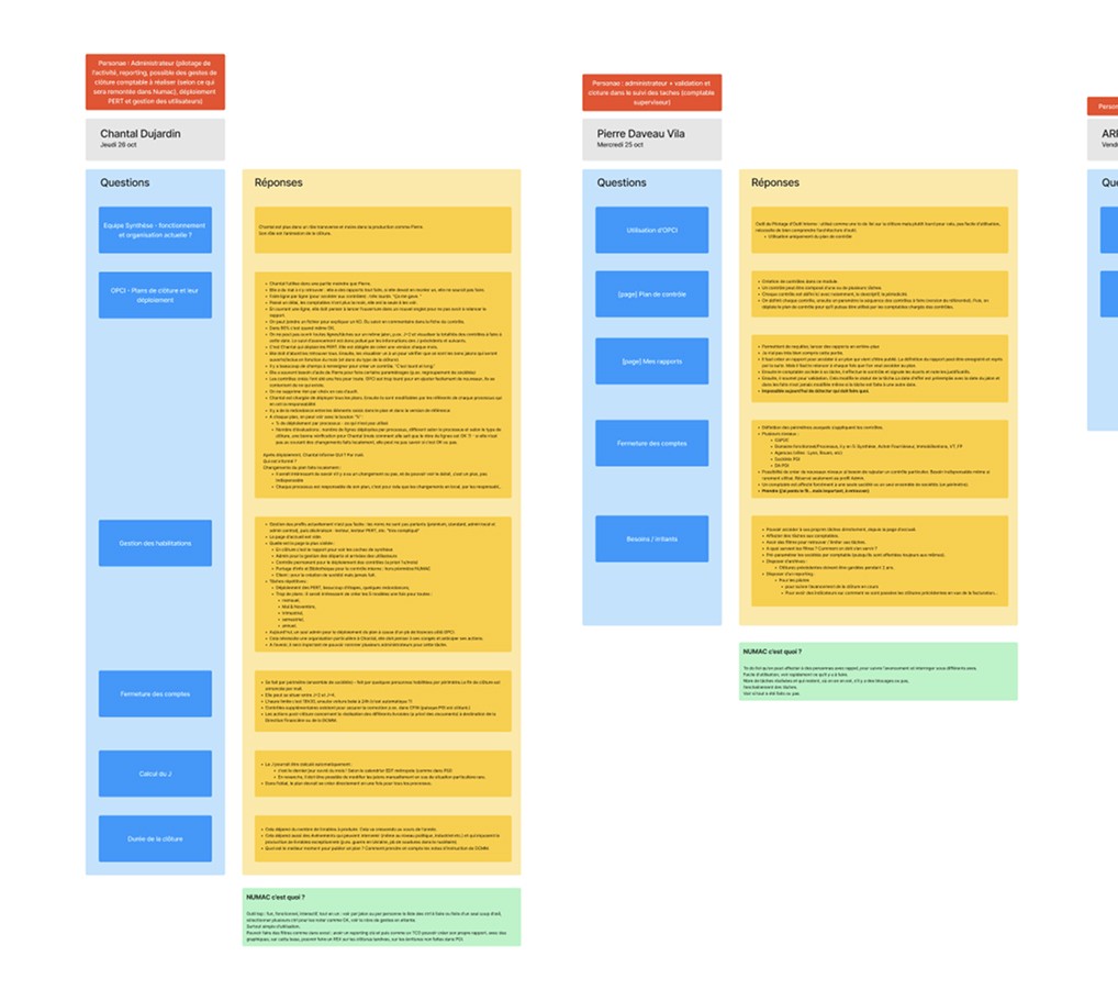 Les retours utilisateurs pendant ces entretiens constitue ensuite une base solide pour affiner et préciser l'expression des besoins. Ces informations servent de guide pour les phases ultérieures du projet, notamment la création de parcours utilisateur, les wireflows, et la conception des maquettes, garantissant ainsi que la refonte de l'outil réponde de manière pertinente aux besoins réels des utilisateurs lors de la clôture comptable.